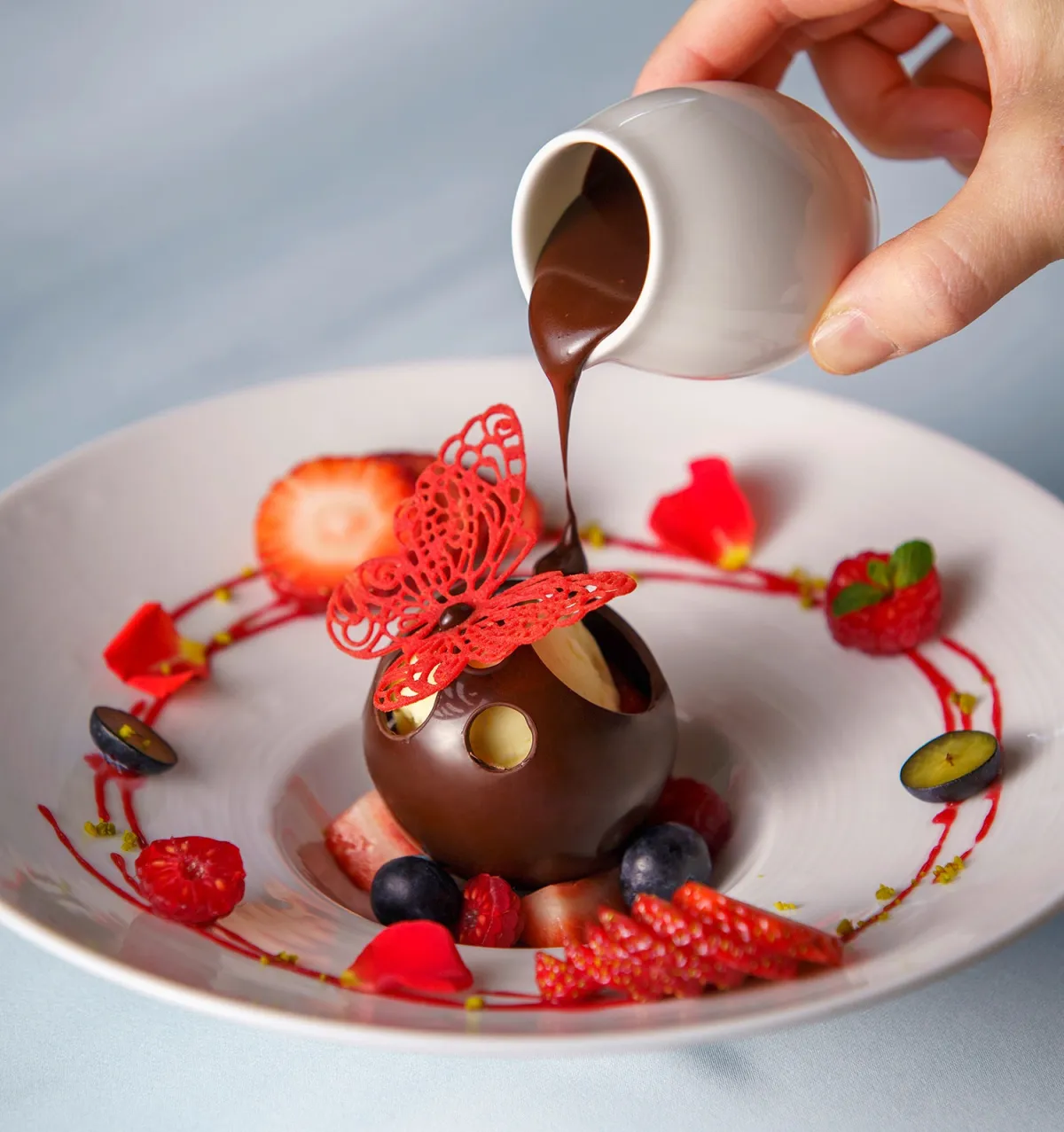 盛り付けには、いちごやラズベリーが添えられ、シェフこだわりの薄焼きクッキーで作られた蝶々も飾られています。この華やかな見た目だけでなく、お好みで提供されるホットチョコレートソースをかけることで、冷たいアイスクリームとの相性が抜群です。