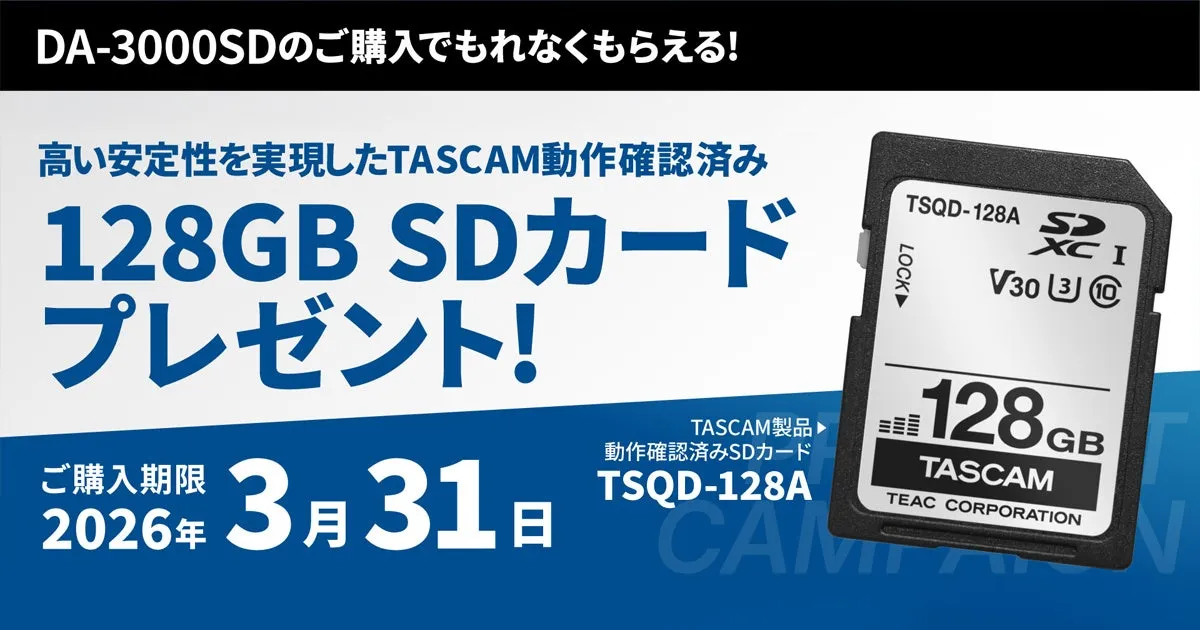 TASCAM(タスカム)は、音楽録音や放送において高い評価を得ているブランドとして知られています。この度、業務用マスターレコーダー『DA-3000SD』の購入者を対象に、特別なキャンペーンを実施します。2025年11月1日より始まるこのキャンペーンでは、TASCAM製品で動作確認済みの128GB SDカード『TSQD-128A』をプレゼントします。これは、購入者にとって非常に嬉しい特典と言えるでしょう。
