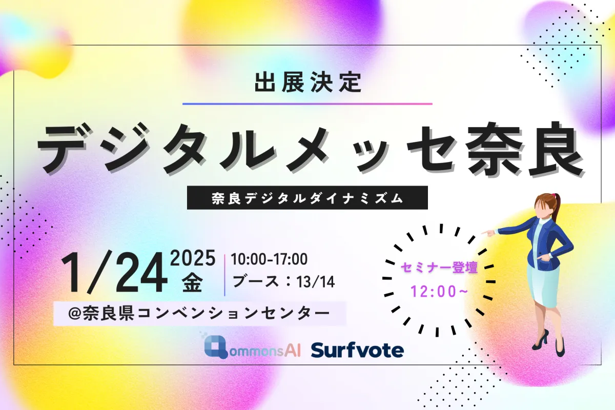 2025年1月24日(金)、奈良県にて県内最大級のデジタル技術展示会「デジタルメッセ奈良」が開催されます。この展示会には、生成AIの分野で先進的な取り組みを行っているPolimill株式会社が出展し、特に注目を集めている生成AIツール『QommonsAI(コモンズAI)』の最新事例を披露します。リリースからわずか3ヶ月で、既に100の自治体に導入された数々の成功事例を実際に見ることができる貴重な機会です。