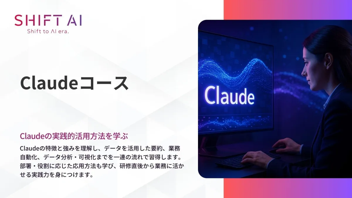 株式会社SHIFT AI(東京都渋谷区、代表取締役:木内翔大)が、2025年8月28日から法人向けに新たなオンライン学習サービス「Claudeコース」をスタートさせる。このコースは、何よりも「日本をAI先進国に」をモットーに、ビジネス利用に特化した生成AIの活用法を学べる内容となっている。