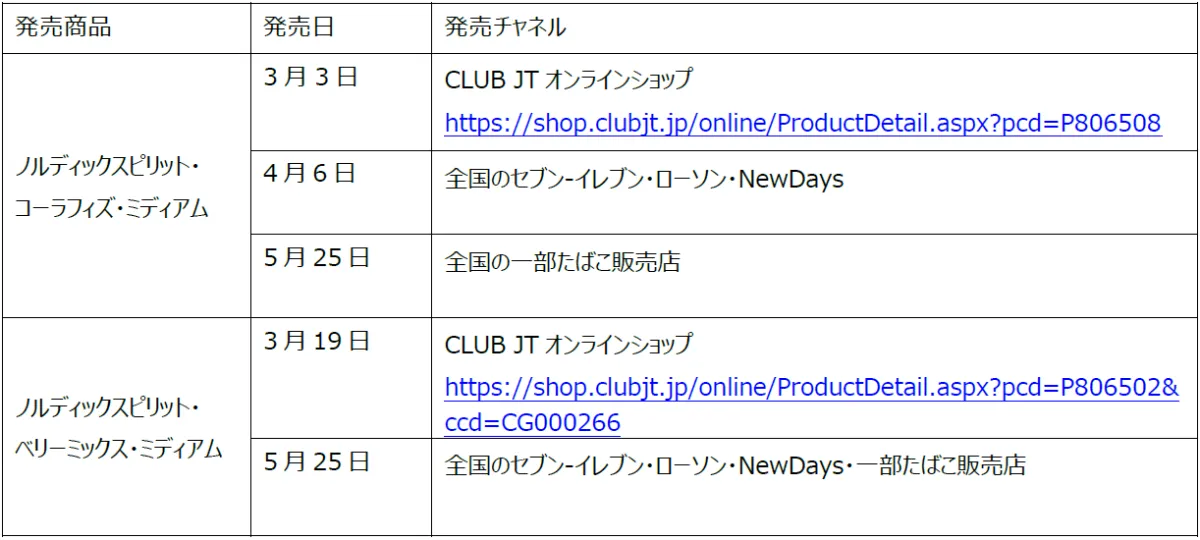 JTは、リフレッシュパウチ「ノルディックスピリット」から新たに「ベリーミックス・ミディアム」を2026年5月25日より全国のセブン-イレブン、ローソン、NewDaysおよび一部たばこ販売店にて順次取り扱うことを発表しました。さらに、同日より「コーラフィズ・ミディアム」も全国の一部たばこ販売店での取り扱いが開始されます。
