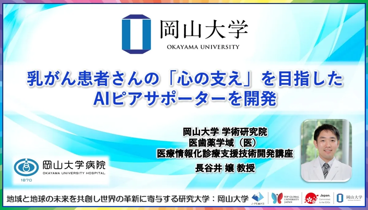 国立大学法人岡山大学の医療情報化診療支援技術開発講座が、乳がん患者を支援するためのAIチャットボット「AIピアサポーター」を開発しました。このAIの目的は、乳がん患者が直面する様々な不安や悩みに寄り添い、心の支えとなることです。特に、化学療法などの治療を受ける際に感じる孤独感や不安を軽減することが期待されています。