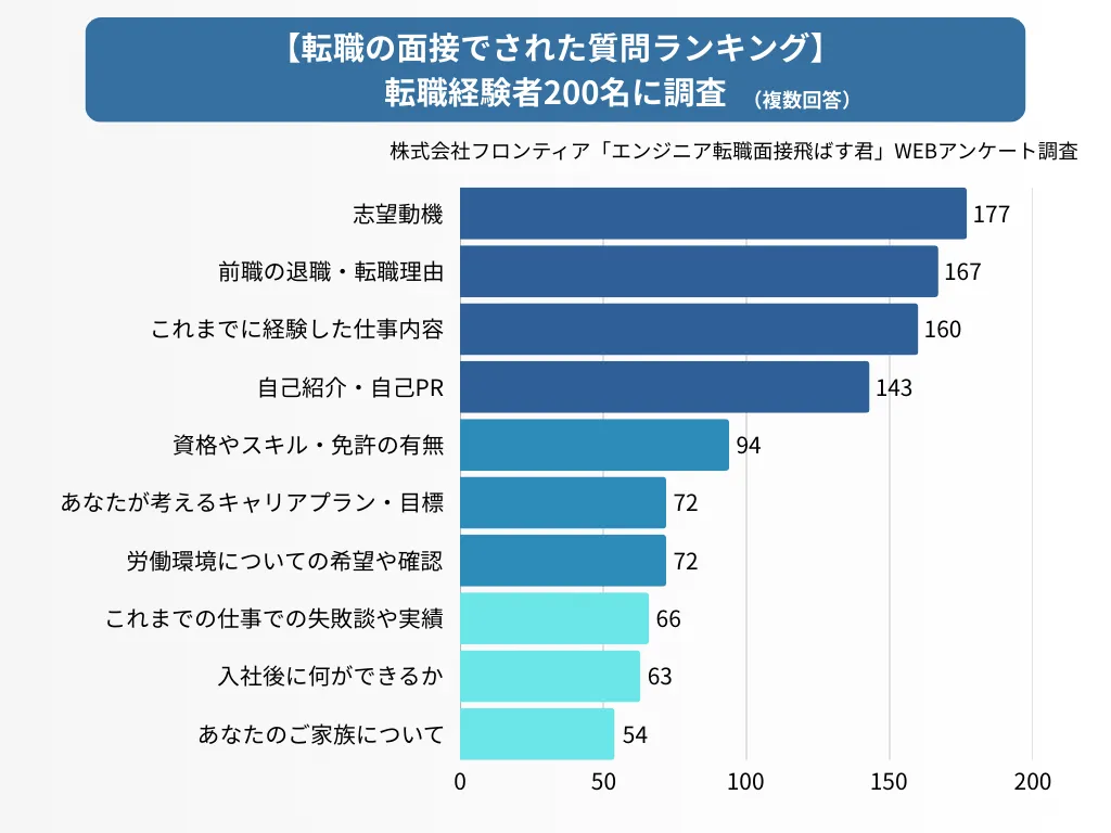 多くの求職者が転職活動において直面する問題の一つが、面接に関する不安です。どんな質問がされるか不明な中、正確な自己アピールが求められるため、事前の対策を行うことが重要とされています。株式会社フロンティアが実施した調査によると、200名の転職経験者において、最も多くの票を集めた質問は「志望動機」であり、次いで「前職の退職理由」や「自己紹介/自己PR」が続きました。
