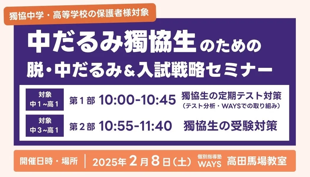 獨協中学・高等学校の保護者の皆様へ、特別な機会をご紹介します。株式会社メイツが運営する「個別指導塾WAYS」では、獨協生を対象にした特徴的なセミナーを開催します。このセミナーでは、多くの生徒が経験する「中だるみ」の解決策と、大学入試に向けた効果的な戦略を学ぶことができます。