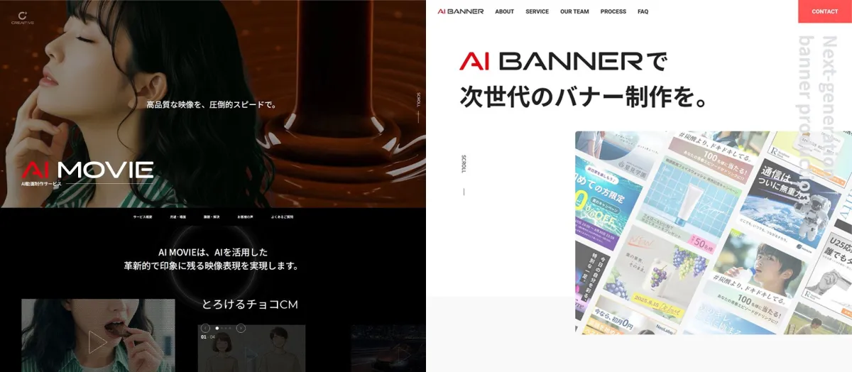 「CREAITIVE」では、動画制作サービス「AI MOVIE」と静止画・バナー制作サービス「AI BANNER」を軸に据えています。AIが生成したビジュアルを、経験豊富なデザイナーが監修し、最終的な形に仕上げることで、高い品質と迅速な制作を両立させることを目指します。