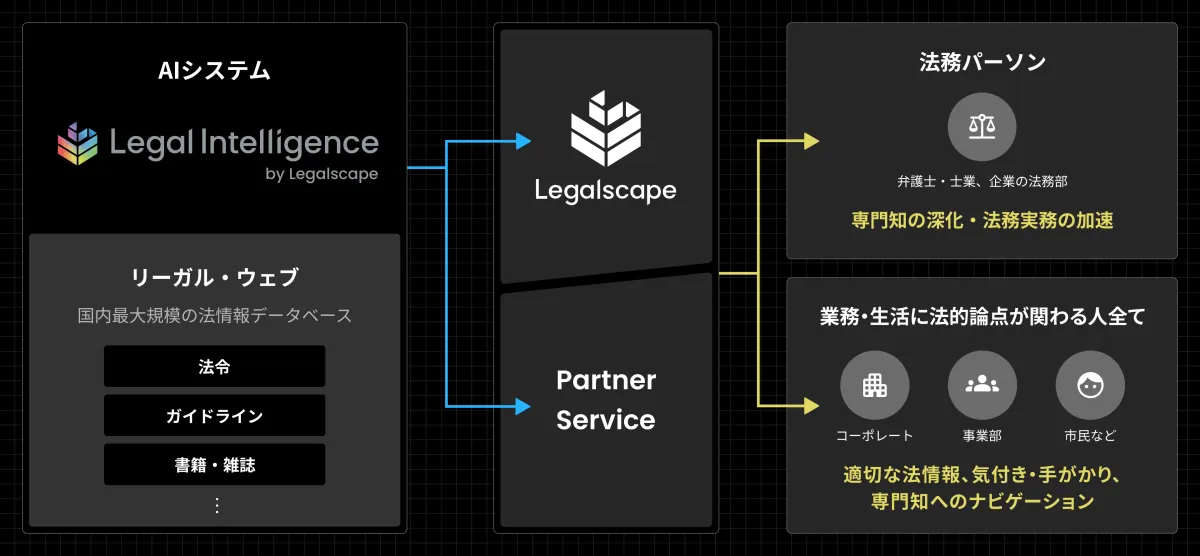『Legal Intelligence』は、多くの出版社やデータベース事業者、研究者、法務実務家と共創しています。これにより、長年にわたって築かれた専門知識やコンテンツがLegalscapeのAI技術を通じて、より多くの人々に利用可能な形にリファインされます。このシステムは、法の価値を社会に広めるエコシステムを構築し、パートナーへの適切な還元も実現します。