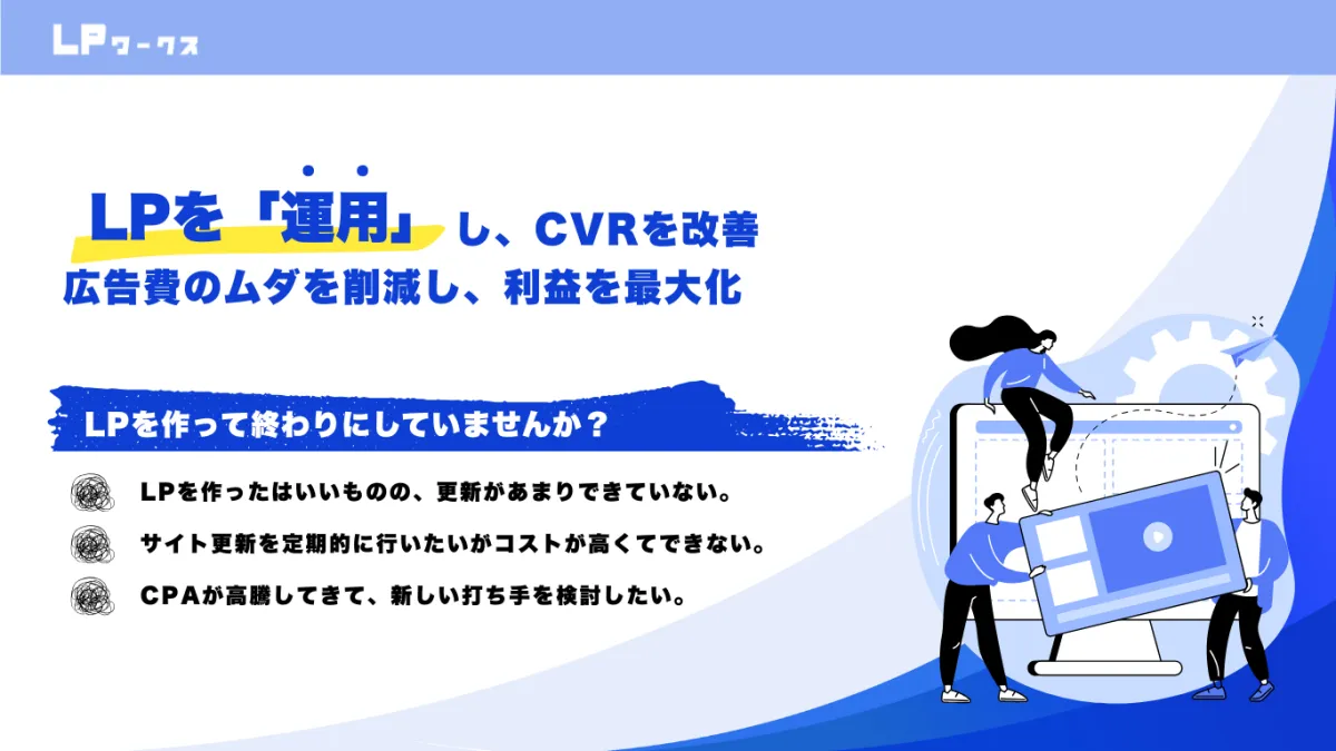 「LPワークス」は、初期のメッセージ戦略の構築から運用フェーズまでをトータルで支援します。具体的には、アクセス解析を通じてユーザー行動を可視化し、定期的に改善案を提示します。また、クリエイティブの制作やコンテンツの差し替えを迅速に行える体制が整えられています。