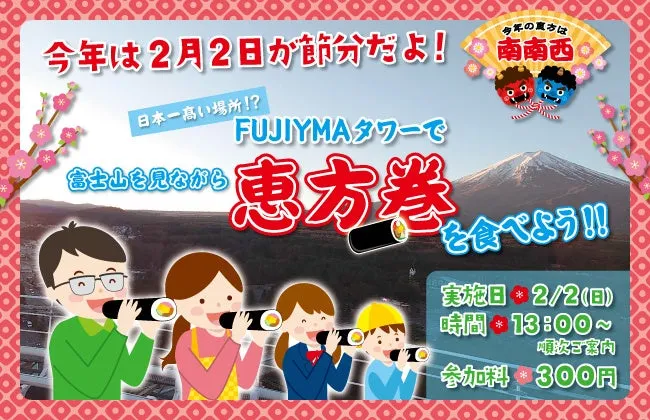 「FUJIYAMAタワーで富士山を見ながら恵方巻を食べよう!」というテーマで行われるこのイベントは、2025年2月2日(日)に限られ、地上55メートルのスカイデッキから富士山を見渡しながら恵方巻を味わいます。視界に入る南南西の方向には、富士山が堂々とそびえ立ち、恵方巻を食べるという日本の伝統を実践するには最適のシチュエーションです。