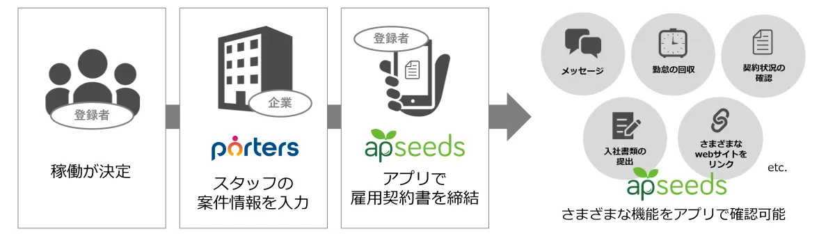 ポーターズが提供する人材派遣向けのマッチングシステム「PORTERS Staffing」と、エーピーシーズの業務アプリ「apseedsポータル」のシステムが連携されることが決まりました。この連携によって、スタッフ情報や契約情報を一元管理することが可能となり、手間のかかっていた連絡業務や契約書の作成が大幅に省略されることが見込まれています。
