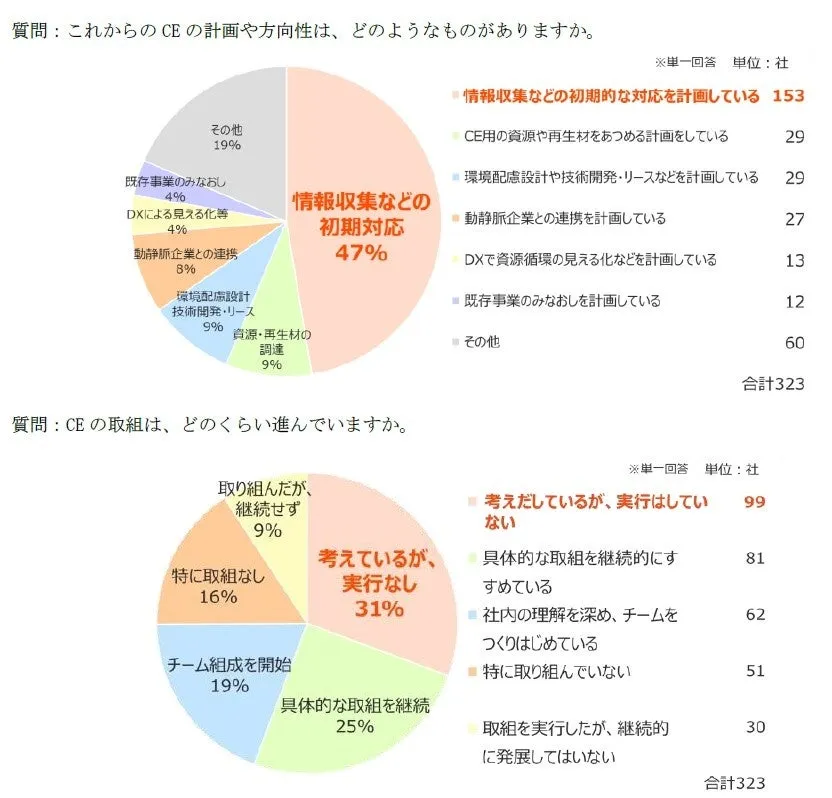 調査によると、CE推進に対する企業の意識は二極化しています。42%の企業が「直ちに対応する必要がある」と感じている一方で、55%は「状況に応じて対応したいが、危機感は薄い」と回答しています。また、47%が初期の対応策を計画しているとし、今後の具体的な取り組みに期待が寄せられます。