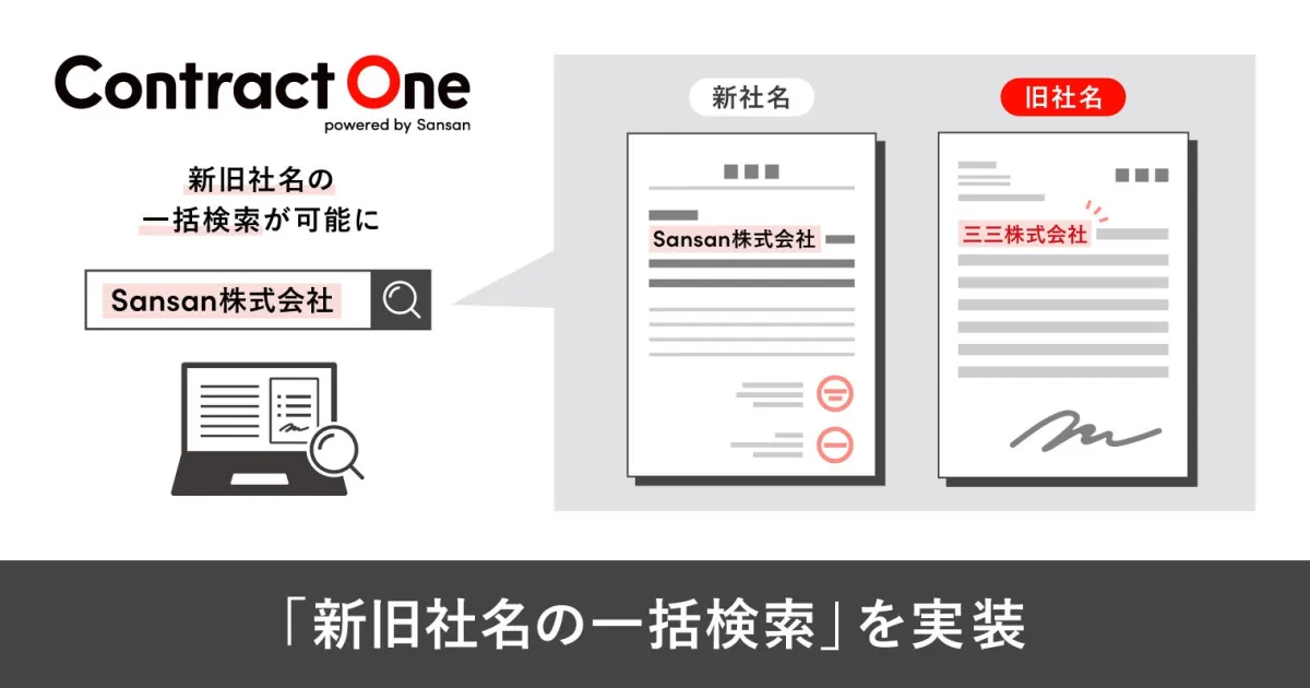 近年、人材不足や激しい市場競争の影響で企業の統廃合、社名変更が増加しています。これにより、契約担当者が社名変更を把握できず、旧社名で契約された契約書の存在を見逃すリスクが浮上していました。そんな状況を背景に、Contract Oneでは新たに社名の一括検索機能を搭載。この機能により、旧社名でも新社名でも、関連する契約書をスムーズに見つけ出すことができます。