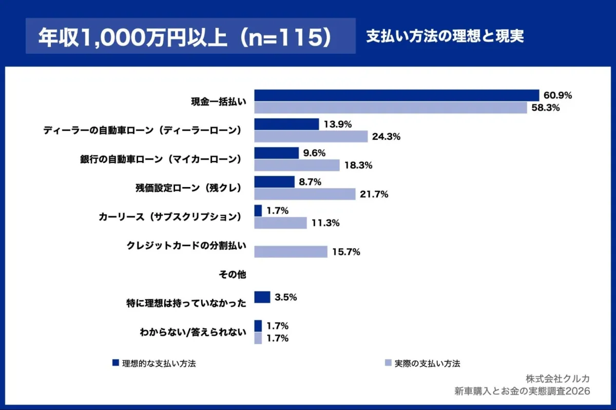 株式会社クルカが実施した「新車購入とお金の実態調査2026」によれば、新車購入を経験した方の約半数が理想の支払い方法として「現金一括払い」を挙げていますが、実際には年収が500万円未満の利用者ではローン利用が顕著に増加しています。ここでは、調査結果を詳しく見ていきましょう。
