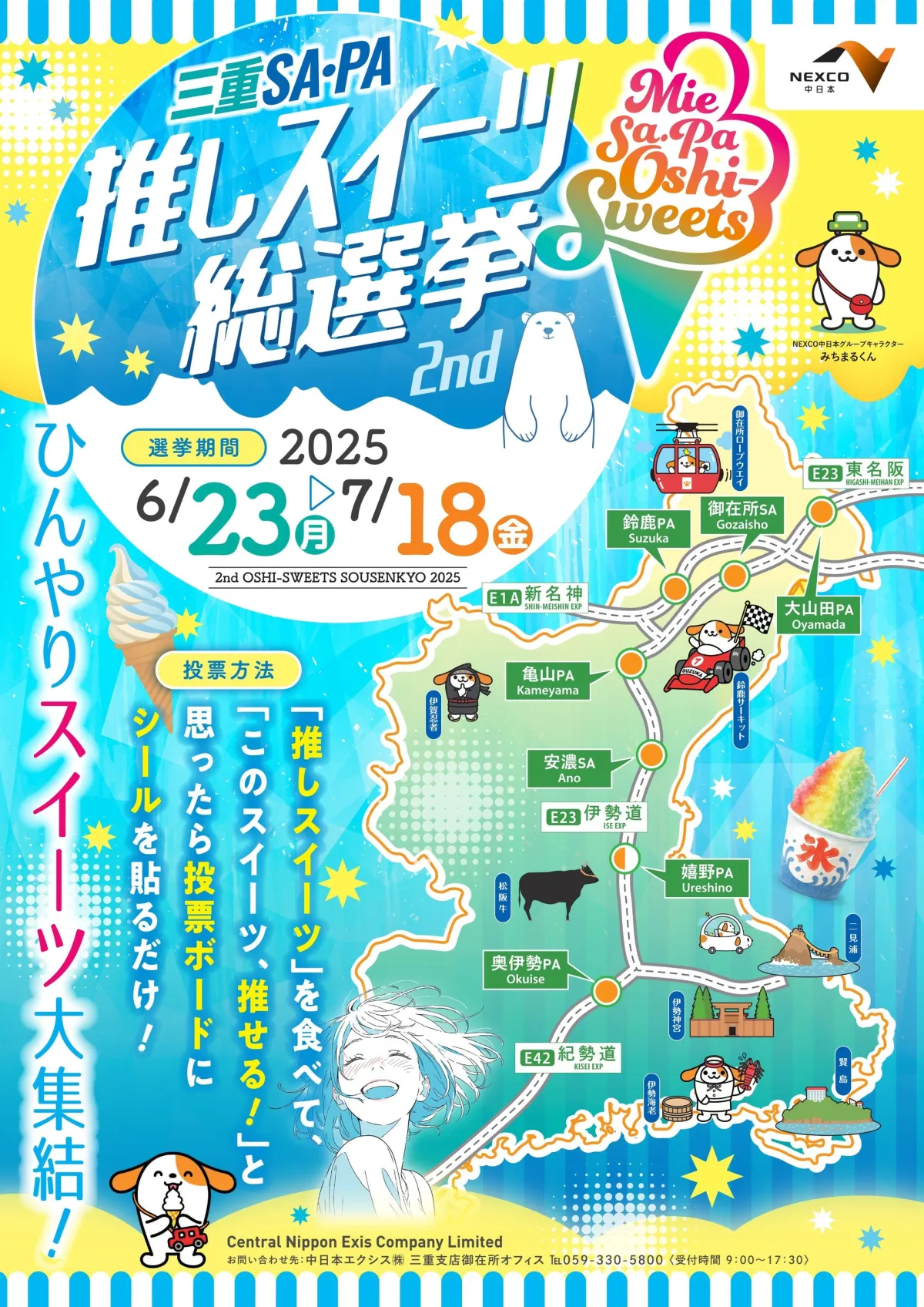 三重県内のサービスエリアやパーキングエリアで、スイーツの頂点を決めるイベント「三重SA・PA推しスイーツ総選挙ひんやりスイーツ大集結!」の開催が発表されました。このイベントは、参加客のお気に入りのスイーツを投票によって競わせ、グランプリを選出するというものです。