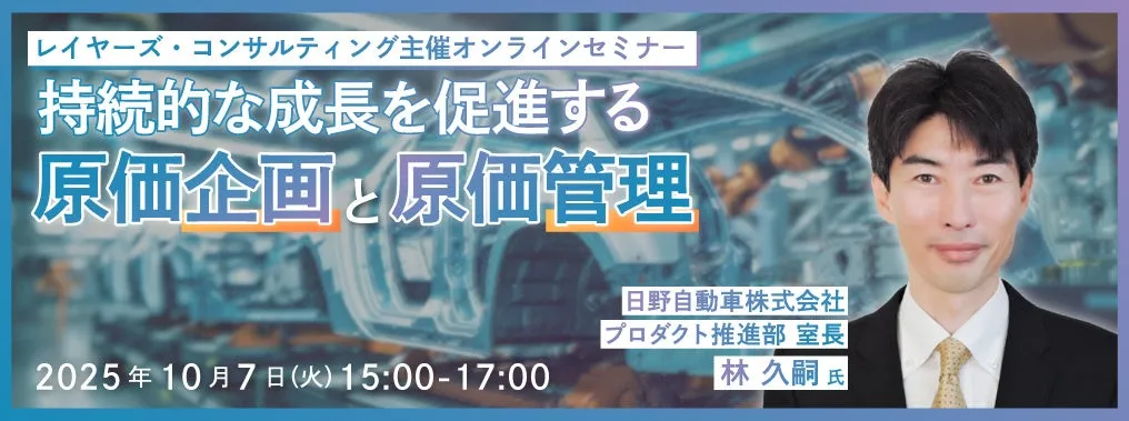 日本の製造業が直面している様々な課題に対応するため、原価管理の重要性が高まっています。2025年10月7日(火)には、株式会社レイヤーズ・コンサルティングがオンラインセミナー「持続的な成長を促進する原価企画と原価管理」を開催することが決定しました。このセミナーでは、トヨタ自動車や日野自動車での豊富な経験を持つ林久嗣氏が基調講演を行います。