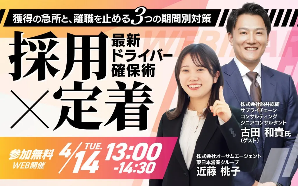 2026年4月14日、株式会社船井総研サプライチェーンコンサルティング(以下、船井総研SC)は、株式会社オーサムエージェントの主催により、運送・物流企業向けのオンラインセミナーを実施しました。テーマは「【採用×定着】最新ドライバー確保術 ~獲得の急所と、離職を止める3つの期間別対策~」。