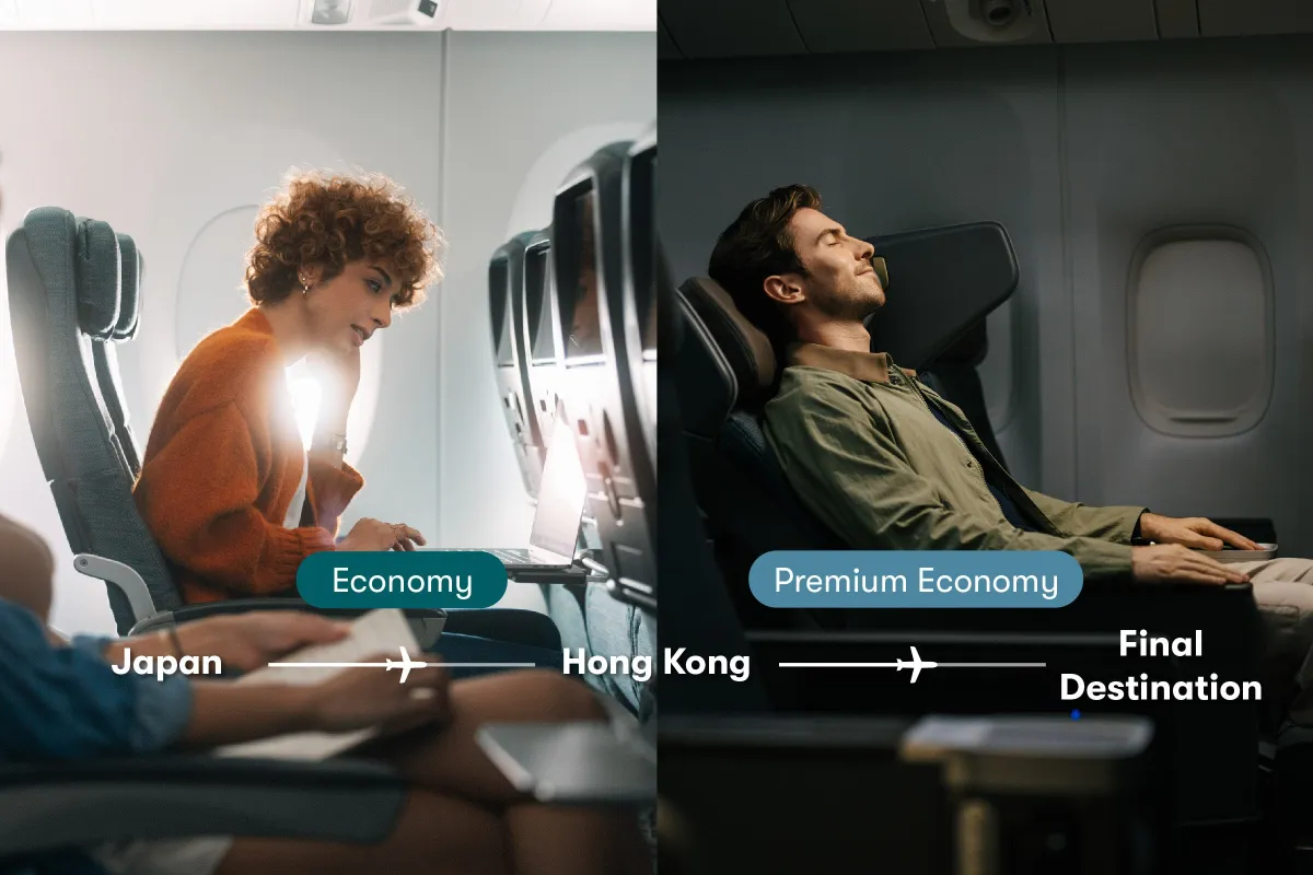 この航空券の特徴は、中長距離路線を利用しながら、出発地と最終目的地で異なる客室クラスを選択できる点です。日本と香港間はエコノミークラスを利用し、その後のフライトはプレミアム・エコノミークラスを選ぶことで、よりくつろげる空の旅が実現します。