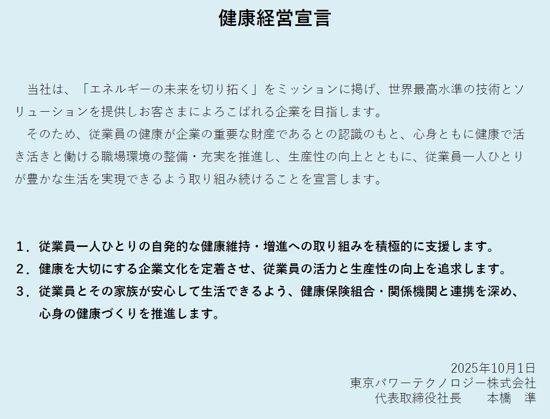 東京パワーテクノロジー株式会社(以下、当社)は、東京都江東区に本社を構え、エネルギー分野を中心に様々な事業を展開する企業です。近年、企業の労働環境や従業員の健康に関する問題が注目される中、当社は「健康経営宣言」を発表しました。これは、従業員の健康を企業戦略の中心に据えるものであり、その結果として企業全体のパフォーマンス向上を目指しています。