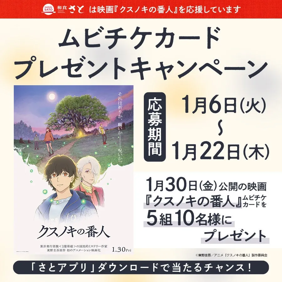 この貴重な機会をお見逃しなく。和食さとのアプリをダウンロードして、映画『クスノキの番人』のムビチケカードを手に入れるチャンスを逃さずに楽しんでください。食事と共に特別な体験ができるこのキャンペーンを通して、前向きな時間を過ごせること間違いなしです!