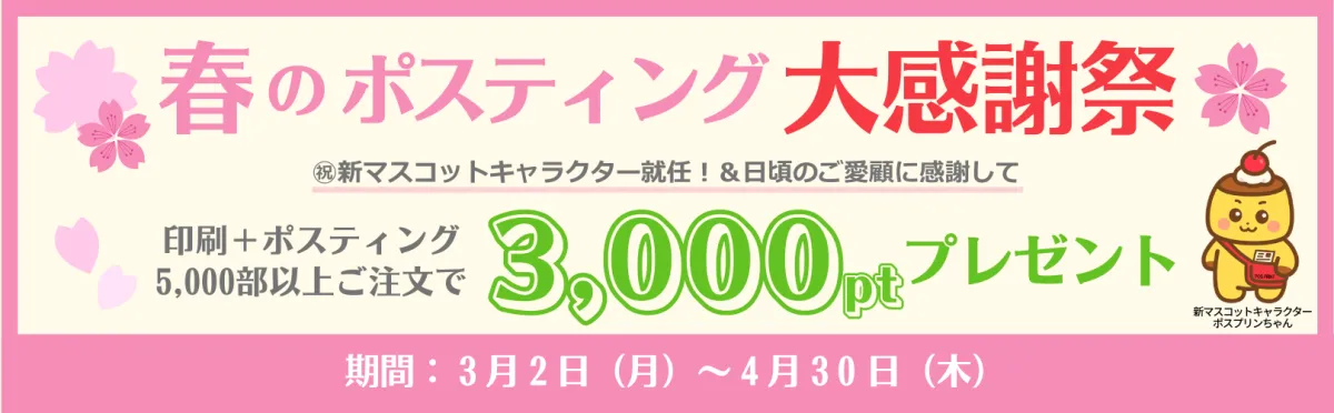 ポスティングサービスを行う「ポスプリント」は、2026年の3月2日から4月30日までの期間で特別なキャンペーンを実施します。この「ポスティング春の大感謝祭」では、法人企業のお客様を対象に、ポスティングサービスを利用された方に3,000ポイントをプレゼントします。また、ポスティングを行った結果の反響を提供してくださった企業には、更に1,000ポイントを追加で進呈する嬉しい特典も用意されています。これにより、実質的な販促コストの削減が可能となります。