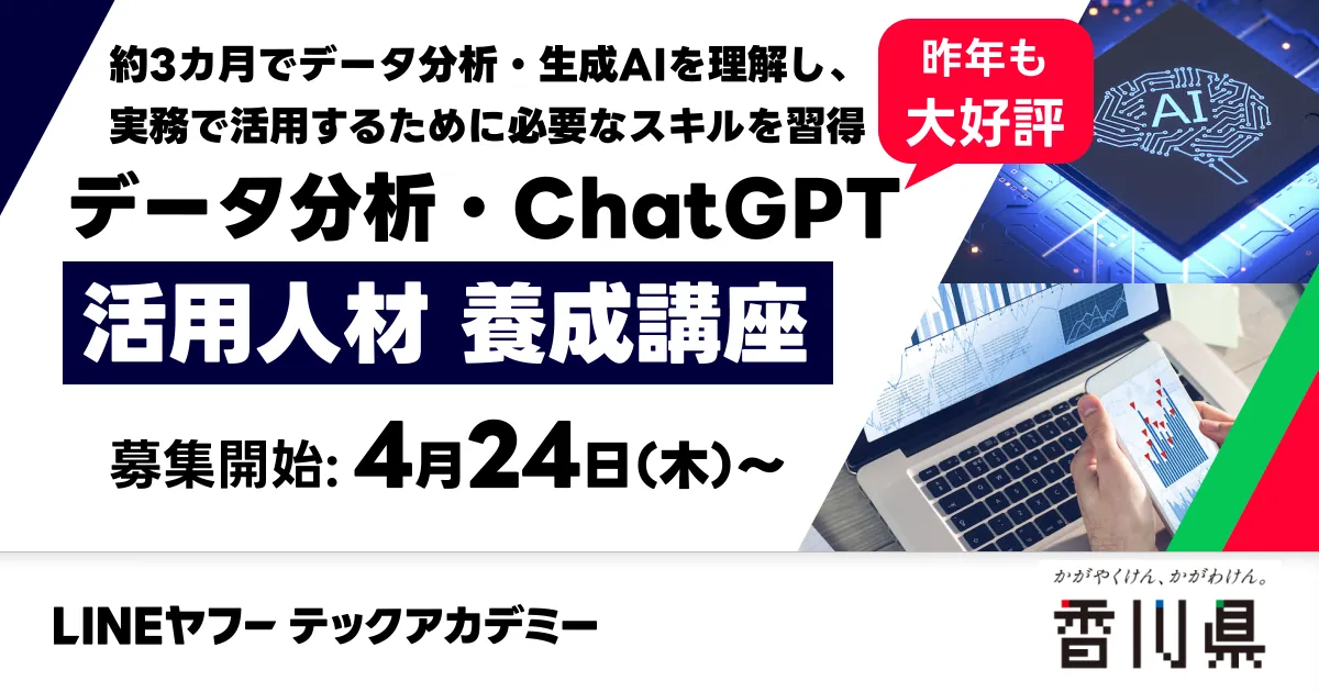 LINEヤフー株式会社(LINEヤフー)と株式会社ブリューアスは、2024年度に続き、香川県の支援のもとで「データ分析・ChatGPT活用人材養成講座」を2025年も実施することを発表しました。この講座は、主にデータ分析や生成AIのスキルを習得することを目的としており、受講生は未経験から約3ヶ月のカリキュラムに沿って必要な知識と技術を学ぶことができます。