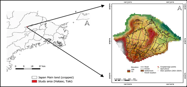 この研究は三重県多気町波多瀬地区を対象に行われ、具体的にはニホンジカが生息しやすい条件と人間との接触リスクを調査しました。研究チームは、環境要因と土地要因を基に、ニホンジカが好む生息地を特定しました。環境要因には降水量や植物量が強く影響していることが分かり、また、集落の位置や人口密度が接触リスクに大きく関与していることが明らかになりました。