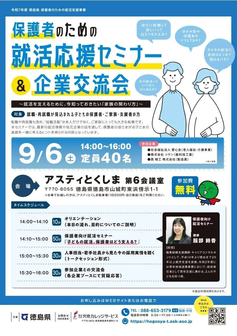 2025年9月6日、徳島で「保護者のための就活応援セミナー&企業交流会」が開催されます。このセミナーは、就職活動を控える子どもを持つ保護者や家族が対象で、最新の採用動向を知り、子どもの進路選びに役立つ情報を得ることができる貴重な機会です。