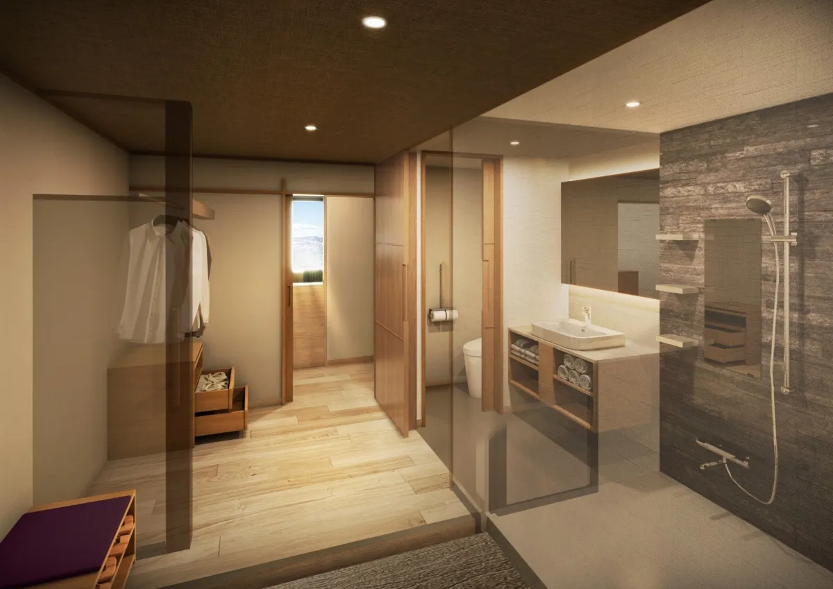 新しい客室は、和の落ち着きとモダンな快適さを兼ね備えたデザインが施されています。具体的には、シモンズ製のベッドを使用した120㎝幅のツインベッドと110㎝の子ベッドを配備し、定員は最大3名。明るく開放的な空間で、北アルプスの眺望を活かした設計が施されています。これにより、さまざまな宿泊スタイルに応じた利用が可能となります。