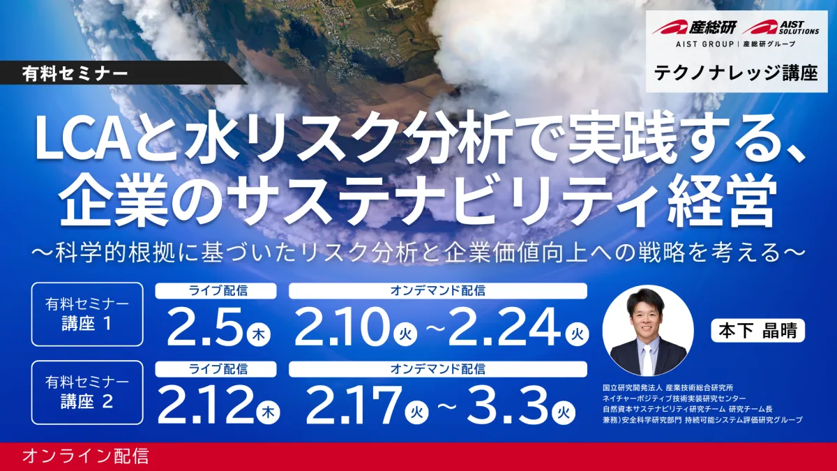 そのような背景の中、株式会社AIST Solutionsが主催するセミナー「LCA × 水リスク分析」が注目を集めています。このセミナーは、国立研究開発法人産業技術総合研究所の本下晶晴氏が講師となり、ライフサイクルアセスメント(LCA)と水リスク分析という二つの手法を基礎から学ぶことができる内容が含まれています。