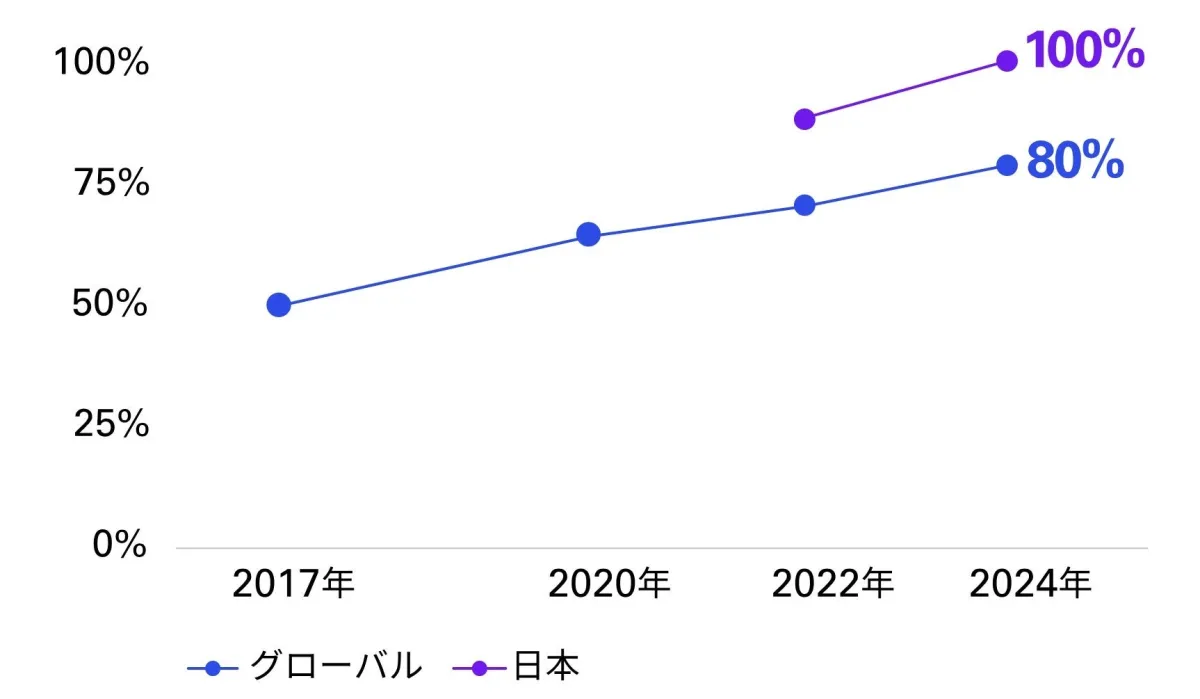 調査対象の企業において、80%が炭素削減目標を公表していることも新たなトレンドです。この割合は前回調査から9ポイント増加し、脱炭素に向けた動きが加速しています。特に日本では、58の国・地域の中で唯一、調査対象100社すべてが目標を公表しているという事実もあり、これは日本企業がエネルギー使用や炭素排出に関する法規制に迅速に対応していることを示しています。