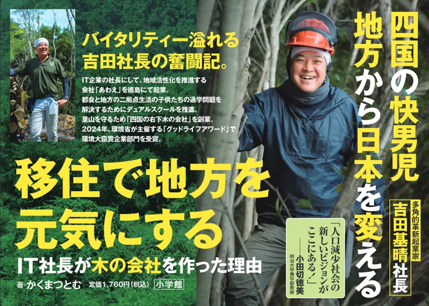 2025年4月1日、株式会社四国の右下木の会社の代表取締役である吉田基晴の著書「移住で地方を元気にするIT社長が木の会社を作った理由」が小学館より発刊されます。本書では、彼が徳島で進める「移住とビジネス」の取り組みを通じて、地域資源を活かした新しい地方創生の可能性を掘り下げていきます。