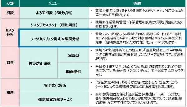 イースリーは今回の連携により、高年齢労働者の「フィジカルリスク測定・集団分析」を担当します。この測定を通じて、個人の身体機能を客観的に判断し、全体的な身体機能のリスクを可視化します。これにより、企業は危険を予測し、適切な対策を講じることが可能になります。