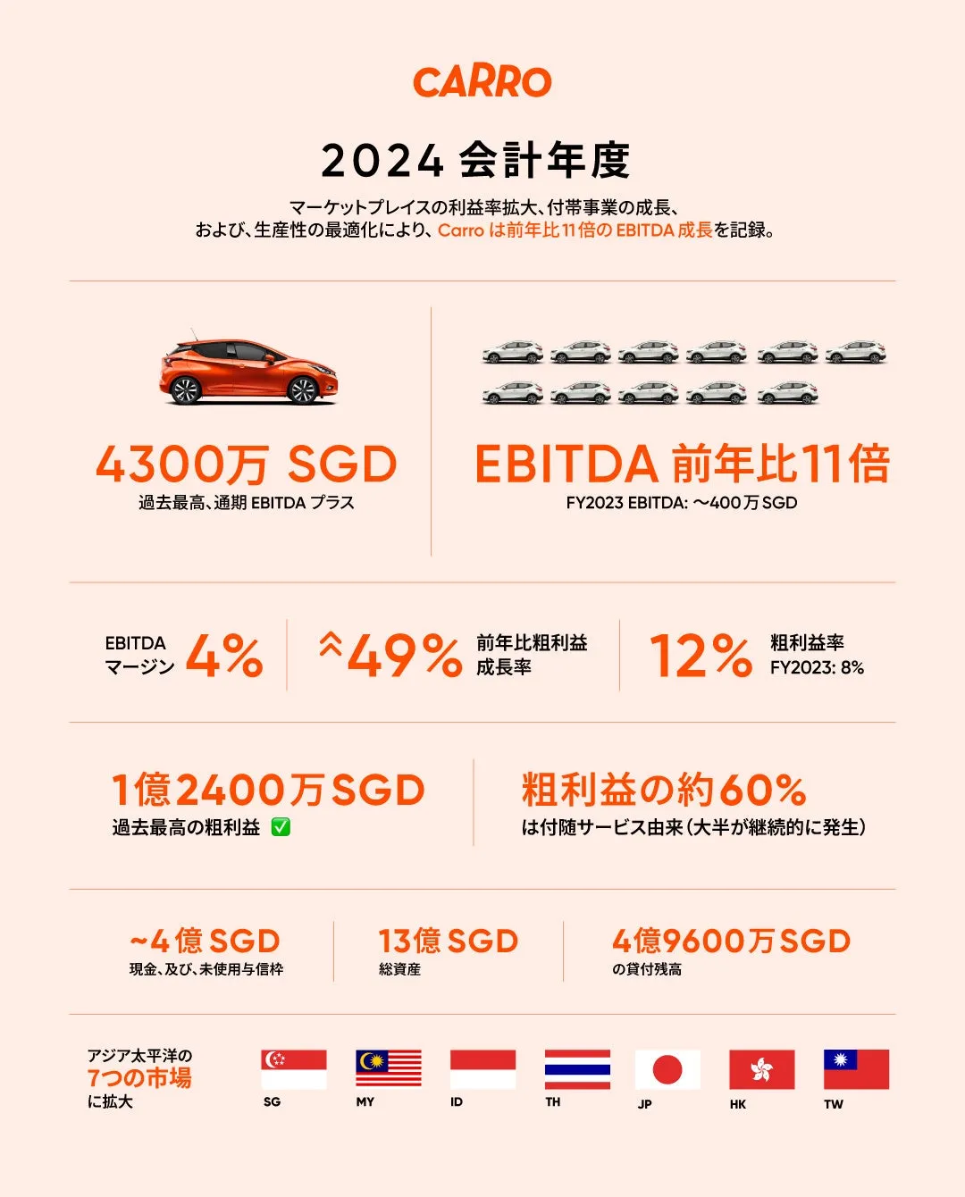 シンガポールを拠点とするCarroは、アジア太平洋地域におけるオンライン中古車プラットフォームとして、2024年度に記録的な業績を達成しました。この結果は、昨年のパフォーマンスを遙かに上回るもので、特にEBITDAで4300万シンガポールドル(約3200万米ドル)を達成したことが注目されています。これにより、同社は前年比11倍という驚異的な成長を実現しました。