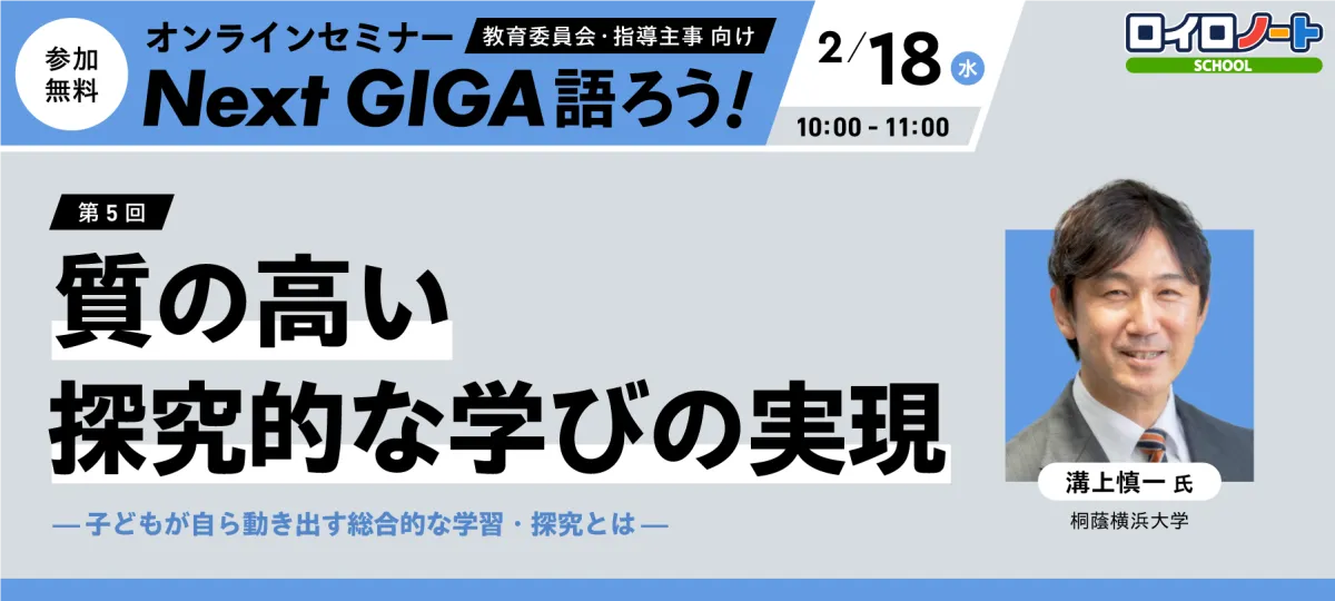 2026年2月18日(水)、教育関係者向けにオンラインセミナー「Next GIGA語ろう!2026」の第5回が開催されます。今回のテーマは「質の高い探究的な学びの実現」で、学校法人桐蔭学園理事長である溝上慎一氏がゲスト講演を行います。これまでの教育課程には欠かせないキーワードとして浮上している「探究的な学び」の重要性について、実践事例を交えながら深く掘り下げていきます。