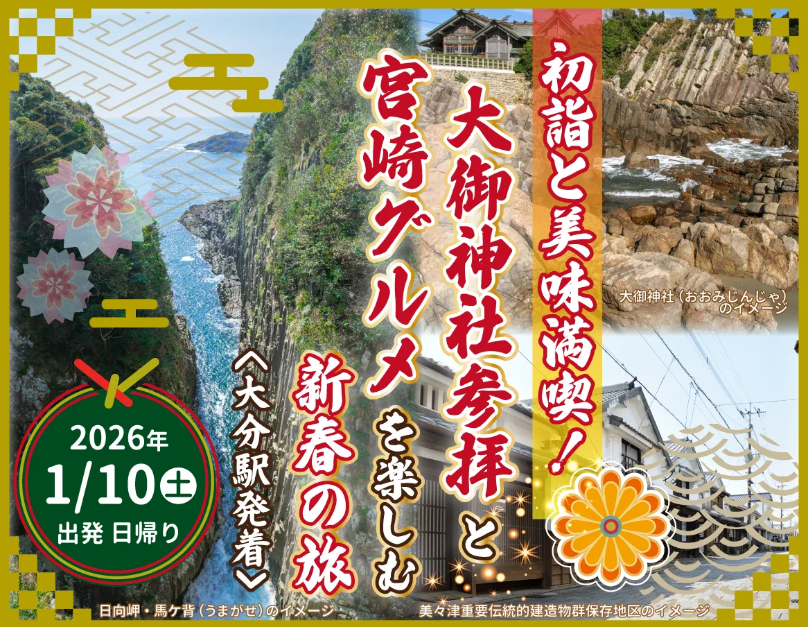 この新春、皆様のご参加を心よりお待ちしています。歴史ある神社で初詣をし、宮崎の美味しい料理を堪能する特別な日帰りツアーを、ぜひお見逃しなく!