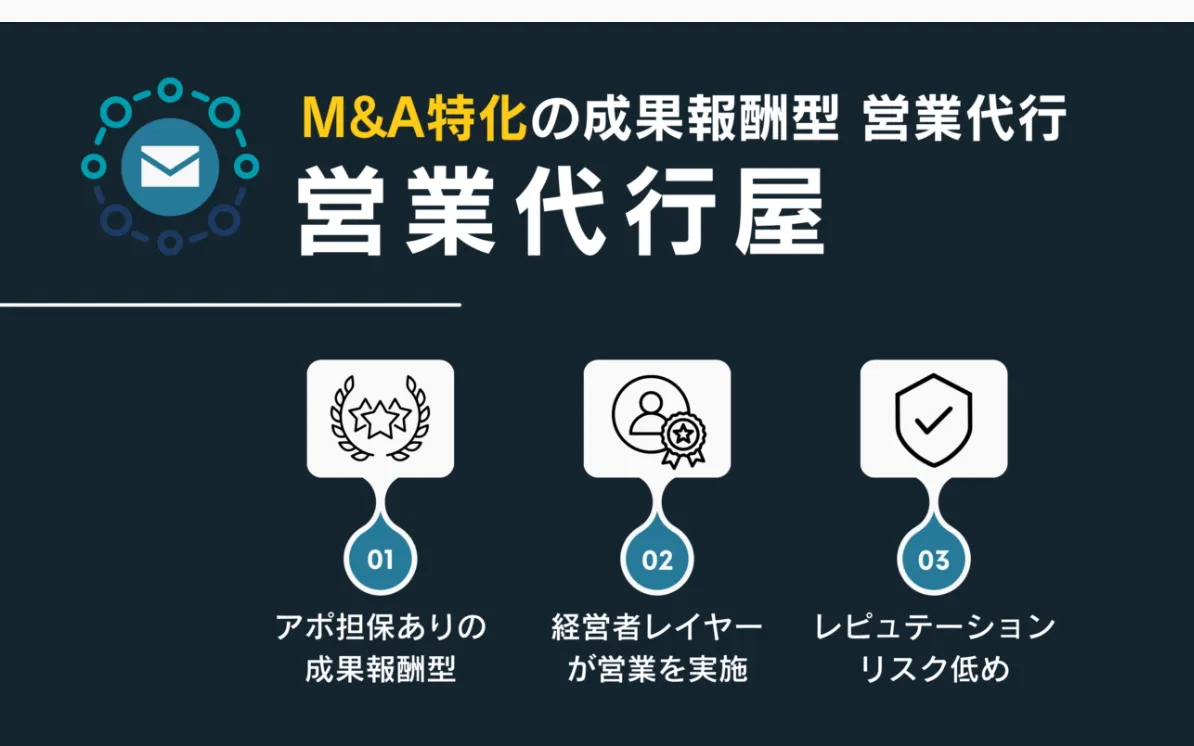 こうした特徴により、『営業代行屋』は買い手企業のM&A活動を効率化し、理想的な売り手企業との出会いを実現します。従来の待ちの姿勢から脱却し、主体的に売り手探索を行う時代にあって、『営業代行屋』は新たな戦略的パートナーとなるでしょう。