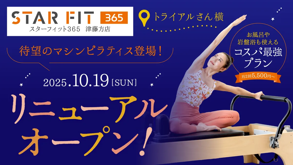 2025年10月19日(日)、三重県津市にあるモール型スポーツジム『スターフィット365 津藤方店』がリニューアルオープンします。108年の歴史を持つウェルネス企業、SDエンターテイメント株式会社によるもので、今回の改装で女性専用のマシンピラティスが新たに導入されます。
