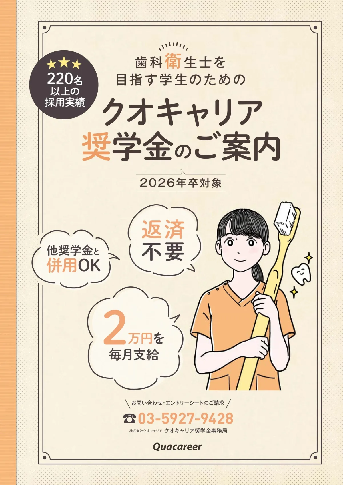 株式会社クオキャリアが、2025年度の歯科衛生士奨学生の募集中です。この奨学金制度は、予防歯科の重要性が高まる中、歯科衛生士を目指す学生の経済的な負担を軽減することを目的としています。これまで220名以上の学生に支援を行ってきた実績があります。
