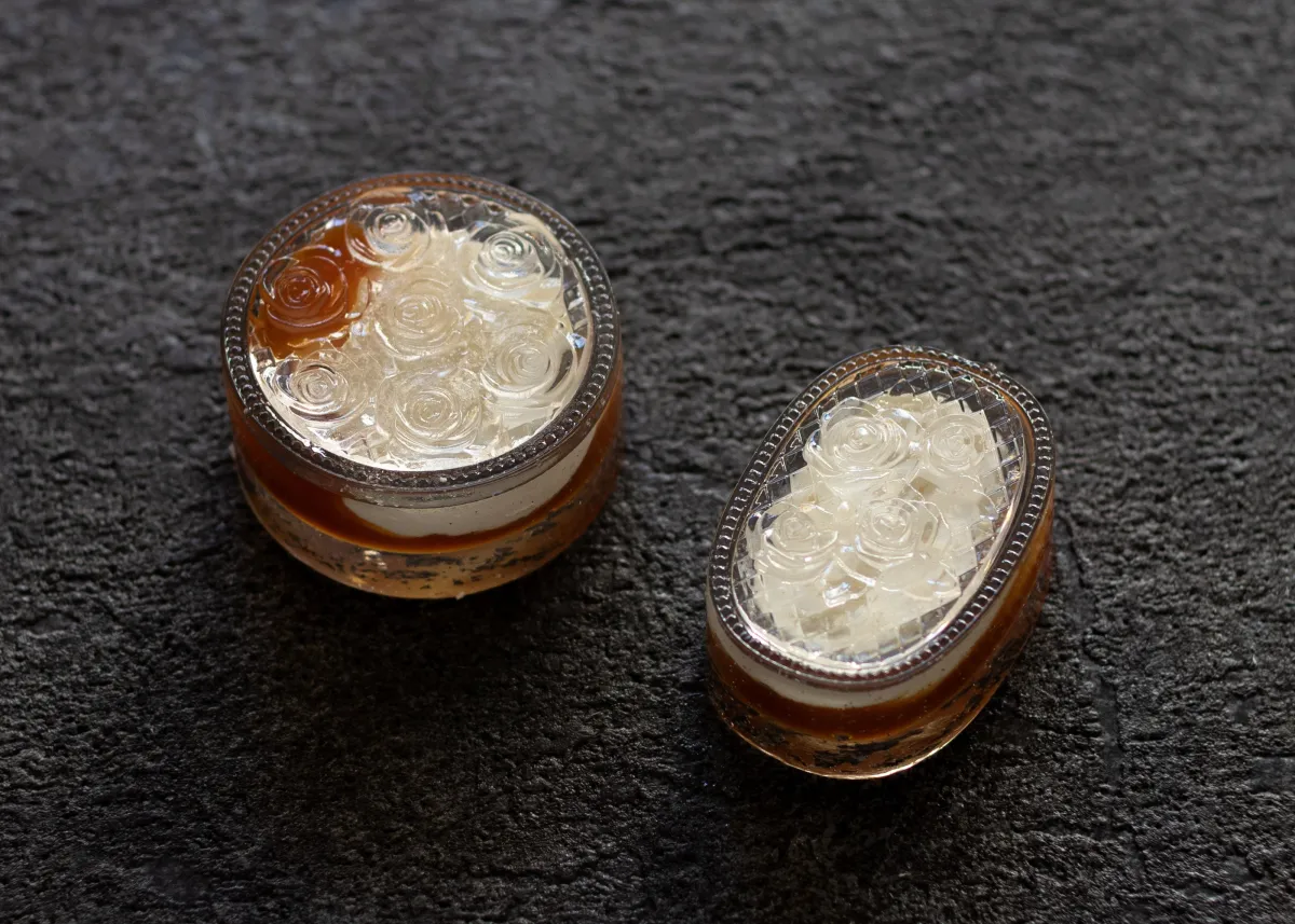 一方、宝鏡の形をした後者は、オーバルな形状が特徴で、滑らかな表面にバラのレリーフが施されています。透明な水晶の中に深い苦味のキャラメルが封じ込められているため、風味豊かな大人向けの味わいです。