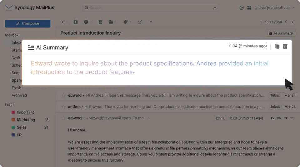 Synology MailPlusは、生成AIを利用することで、ユーザーのメール管理を大幅に改善します。大量のメールに圧倒されるのはビジネスパーソンの悩みですが、MailPlus AIはその解決策です。機能の中には、長引くメールスレッドを自動的に要約したり、次に行うべきアクションを提案したりするものがあります。これにより重要なメールの優先順位が高まり、即座に反応が求められる交流をスムーズに進めることができます。