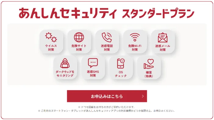 スタンダードプランには、ウイルス対策や危険サイトのブロック、迷惑通信の対策などが含まれています。さらに、もしスマートフォンやタブレットが不正利用された場合の補償が適用され、ウイルスによる端末故障もカバーされます。この詳細な保護機能が、利用者から支持されている一因です。