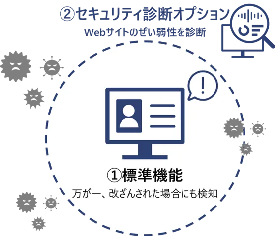 新たに追加されたセキュリティ診断オプションは、Webサイトの脆弱性を毎日自動的にチェックする機能です。この診断はクラウド上で実施されるため、特別な手間をかけずに継続的な監視が可能です。これにより、サイバー攻撃を行う者が脆弱性を悪用することを防止し、フィッシングサイトへの誘導といった犯罪行為からお客様のWebサイトを守ります。