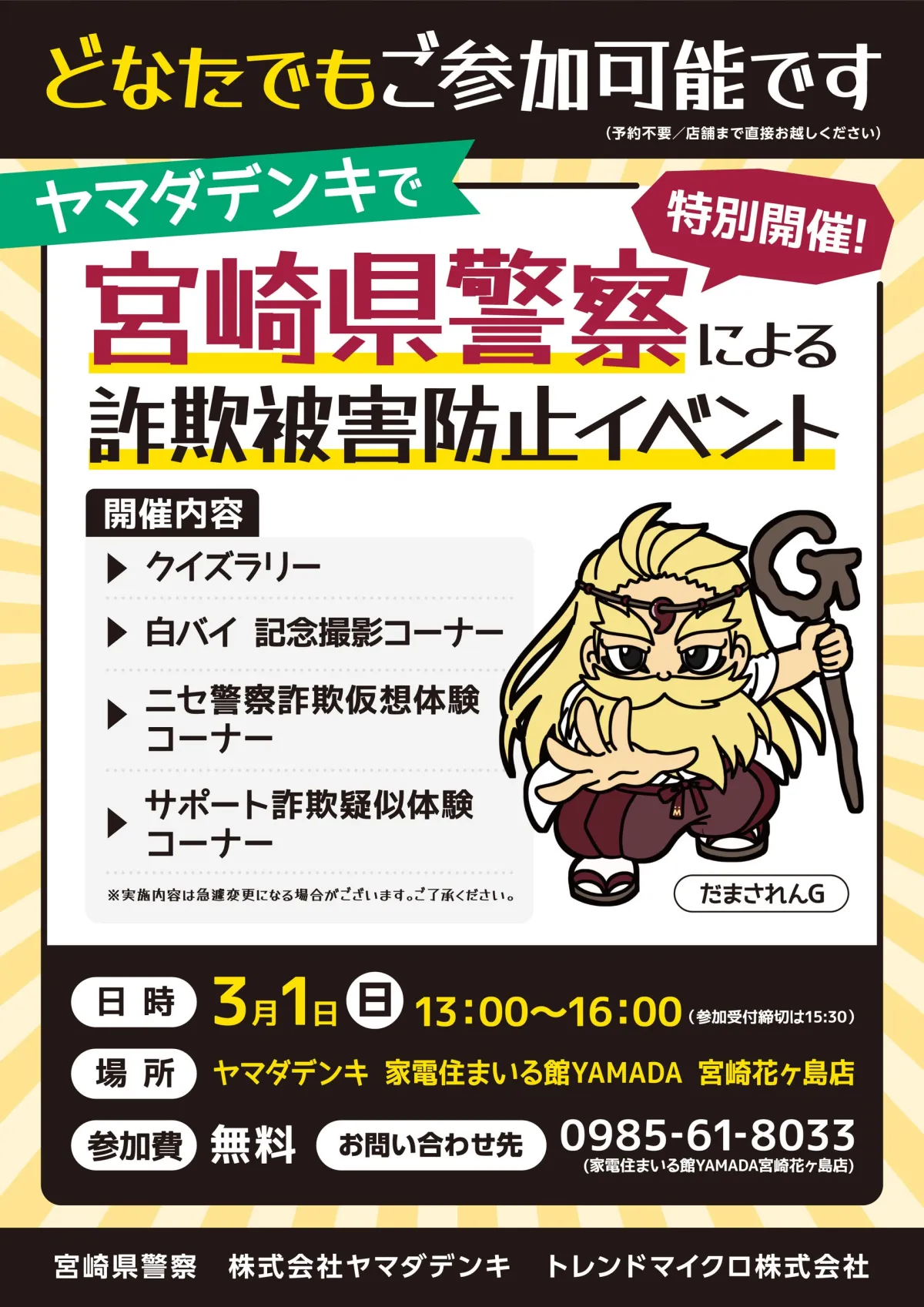 宮崎県警察と協力して、ヤマダホールディングスが開催する「詐欺被害防止イベント」が、2026年3月1日(日)に宮崎市の「家電住まいる館YAMADA 宮崎花ヶ島店」で実施されます。このイベントは、安心して暮らせる社会を目指す取り組みの一環として、犯罪被害の防止に向けた広報啓発活動として位置付けられています。