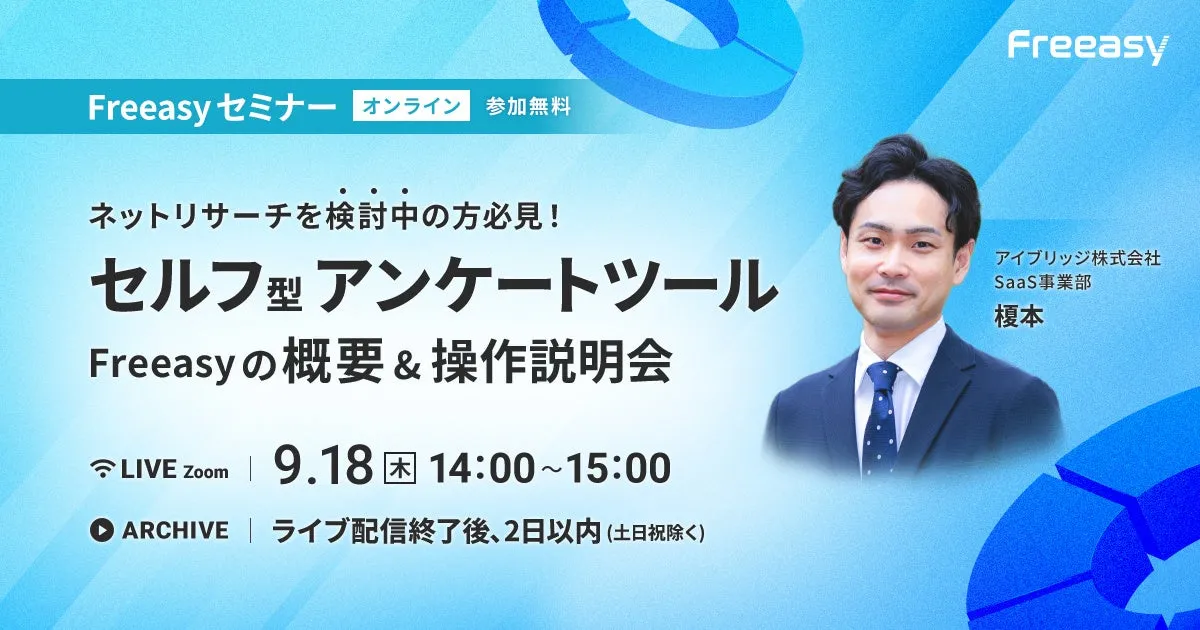 アイブリッジ株式会社が提供する日本最大級のセルフ型アンケートツール「Freeasy(フリージー)」が、2025年9月18日(木)14時からオンラインセミナーを開催します。このセミナーでは、Freeasyの概要やその操作手順を詳しく解説し、ネットリサーチを始めたい方やセルフ型アンケートツールの導入を検討している方にとって有益な情報を提供します。