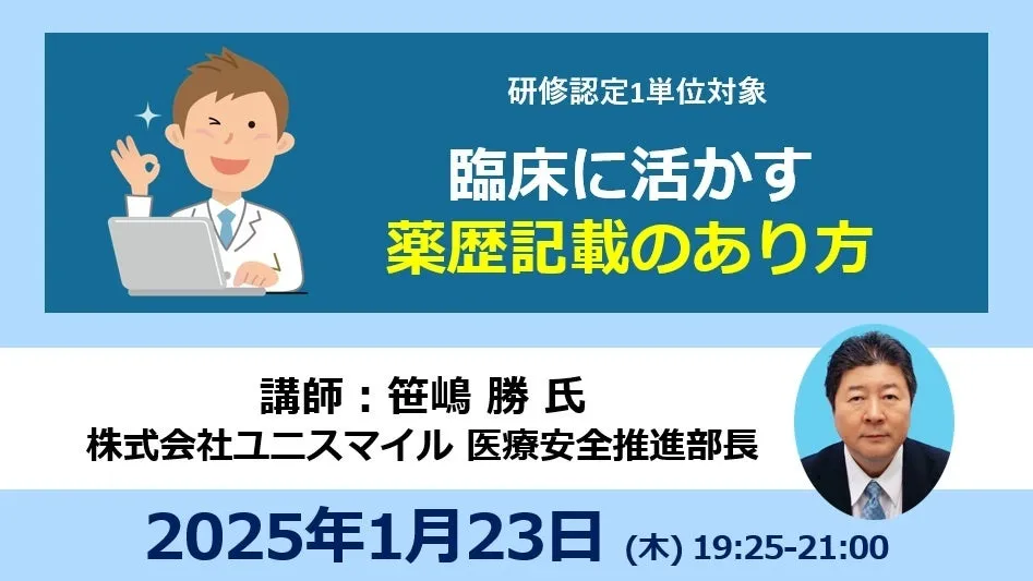 2025年1月23日、株式会社グッドサイクルシステムによるオンラインセミナーが開催されます。このセミナーは、薬局経営者や薬剤師を対象にしたもので、「臨床に活かす薬歴記載のあり方」と題され、株式会社ユニスマイルの医療安全推進部長である笹嶋勝氏を講師として迎えます。