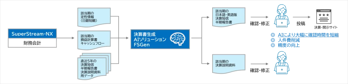 「FSGen」はAI技術をもとに構築された決算資料自動生成ソリューションです。AIの学習、要約、抽出、生成といった機能を活用することで、様々な決算資料を迅速かつ正確に生成することが可能です。その結果、業務の効率化やコスト削減、さらには資料の作成精度向上が実現されます。