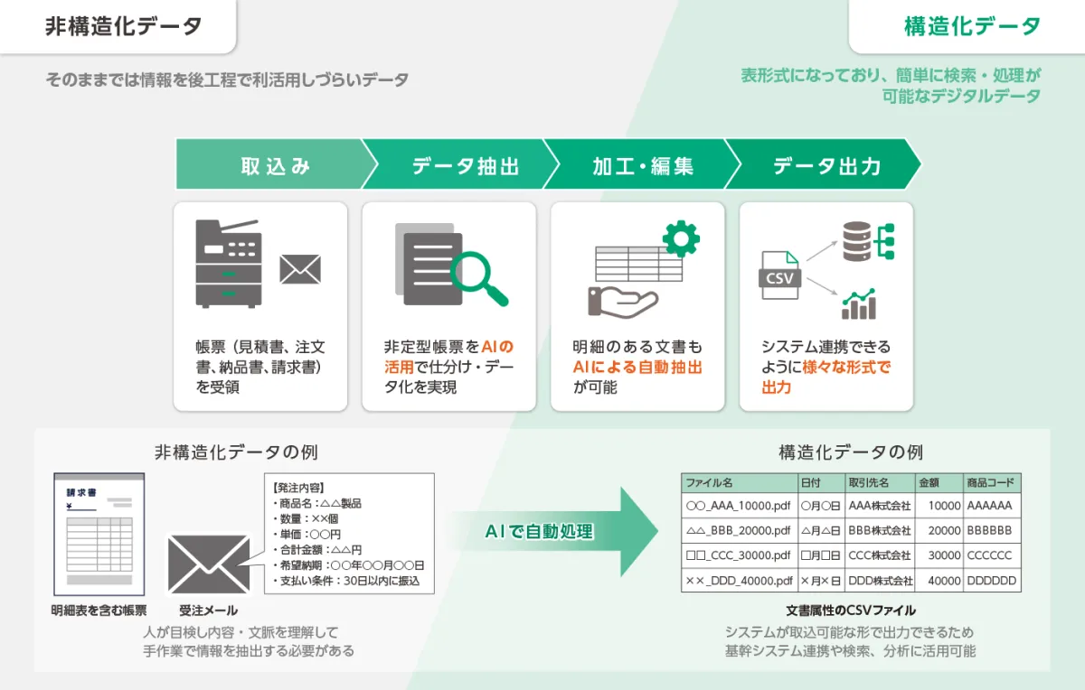 この新機能では、見積書や注文書、納品書、請求書といった非定型帳票を自動的にデータ化し、ビジネスプロセスの円滑化に寄与します。具体的には、スキャナーなどで取り込んだ文書から、必要な情報を自動的に抽出し、後続のシステムにスムーズにインポート可能な形式で出力します。これにより、従来の手作業による入力の手間を大幅に削減できます。