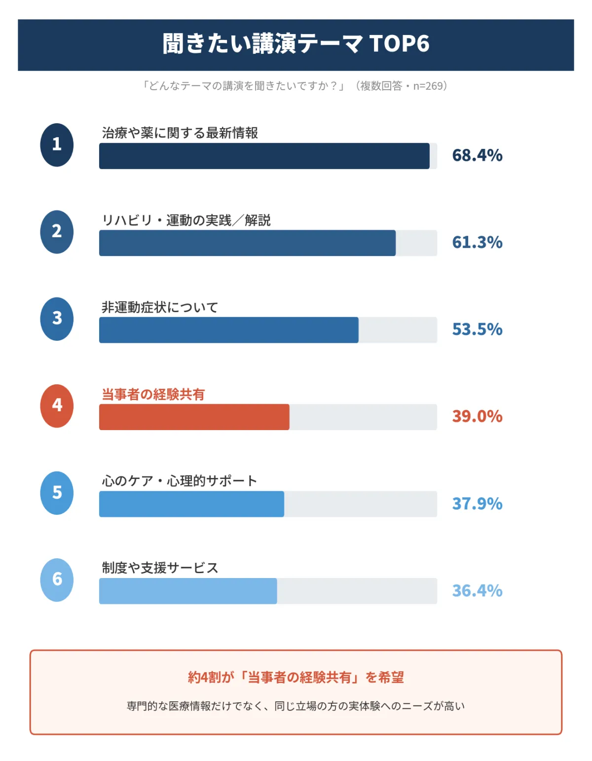 調査によると、患者が最も関心を持つ講演テーマは「治療や薬に関する最新情報」で68.4%がこのテーマを希望しています。次いで、リハビリや運動に関する内容(61.3%)、非運動症状についての情報(53.5%)が続きました。また、日常生活における困難についても、多くの患者が薬や治療法、リハビリ、気持ちのサポートに関心を寄せています。