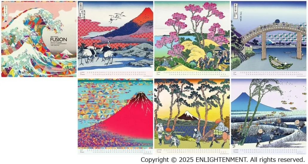 KOMORIは、印刷機械の製造を行う企業として、ブランド価値を高めるためにオリジナルカレンダーの制作に注力しています。2026年版のカレンダーでは、江戸時代の浮世絵師、葛飾北斎の名作「富嶽三十六景」をテーマにした「NEO HOKUSAI」を採用し、クリエイティブユニットENLIGHTENMENTが現代の視点で新たに再創造しました。