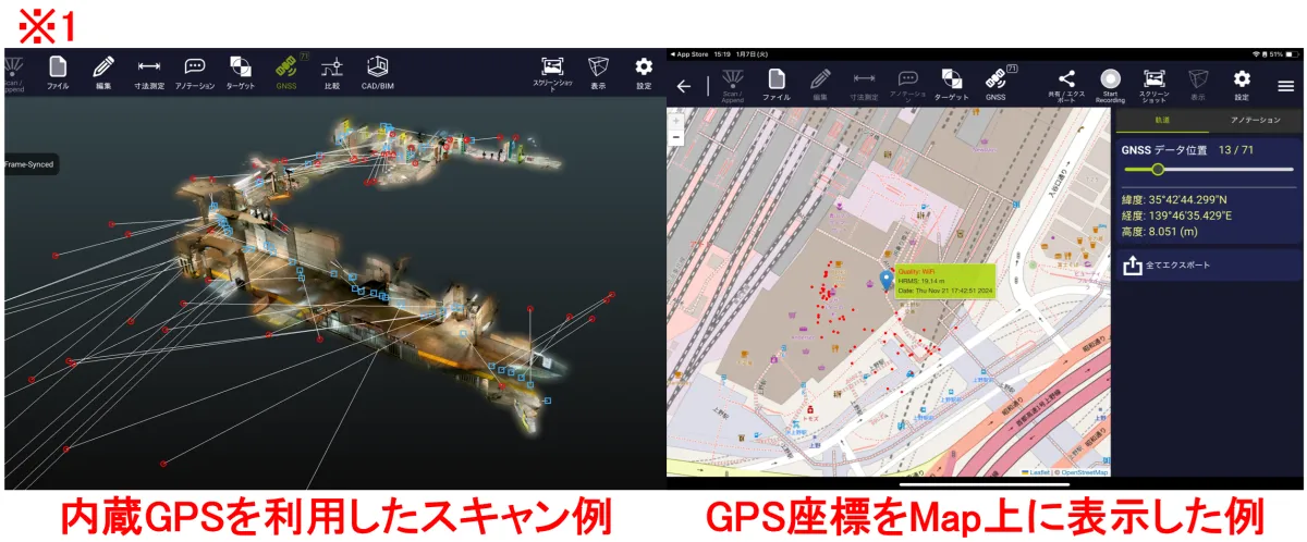 - - GPS座標連動機能:Dot3D PRIMEとPROモデルでは本体内蔵のGPSが活用され、スキャンデータと座標が連携できます。
