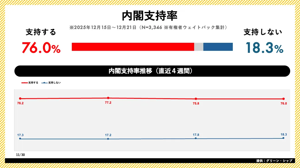 日次世論調査「世論レーダー」が発表する週次集計によると、高市内閣の支持率は76.0%に達しました。この数字は前週からわずかに上昇しており、支持率は今後の政局にどのような影響を与えるのか注目が集まっています。また、同様に自民党の支持率も29.1%と微増で、これからの政治活動にどのように影響するのか興味深いところです。